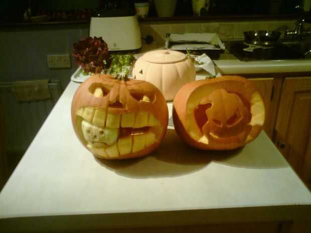 estos son algunos de mis calabazas talladas. Las técnicas se describen bien en Instructables y otros lugares (por ejemplo utilizando una Dremel para cortar solamente el espesor parcial), pero pensé que estos disfrutarse. La mejor parte, creo, es en