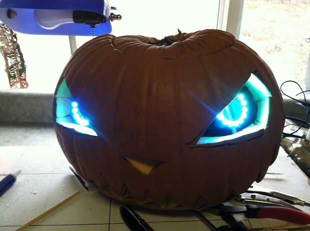 Tallado de calabaza de espuma de poliestireno con brillo en los ojos oscuros