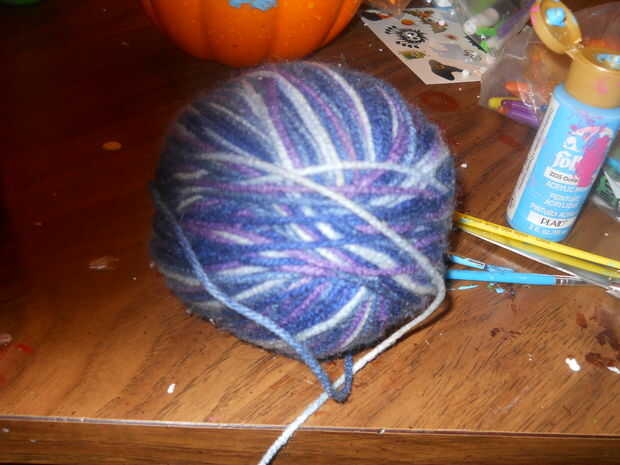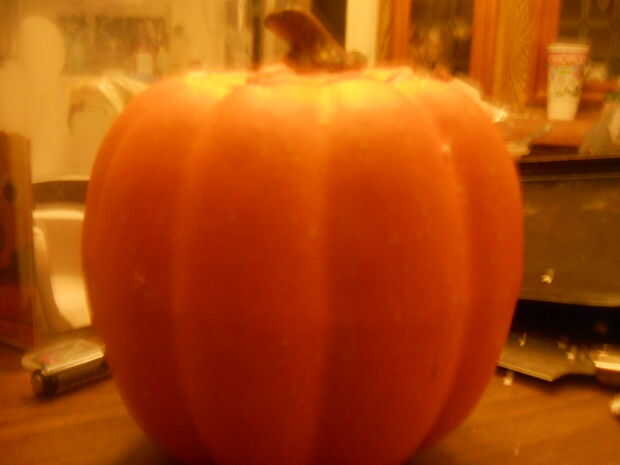 usé una divertida calabaza enfrenta decoración kit, un cuchillo pequeño, hilo para el pelo, cinta para ductos ((no fotografiado)), pintura y una botella de resplandor en la pintura de tela oscura.