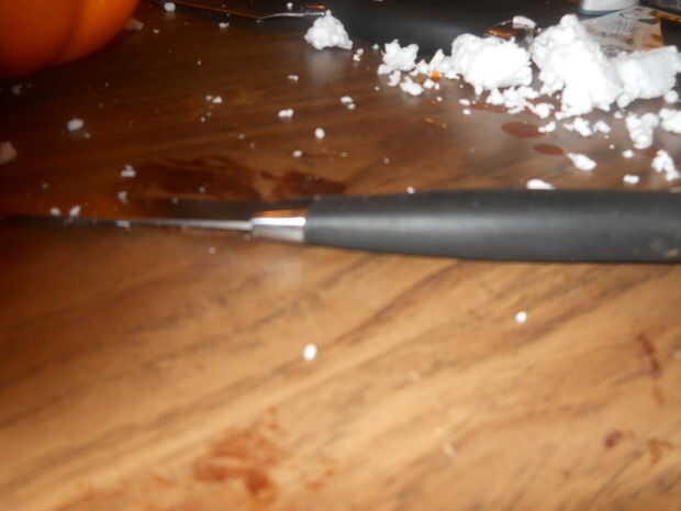Tallado de calabaza de espuma de poliestireno con brillo en los ojos oscuros (1 / 4 paso)