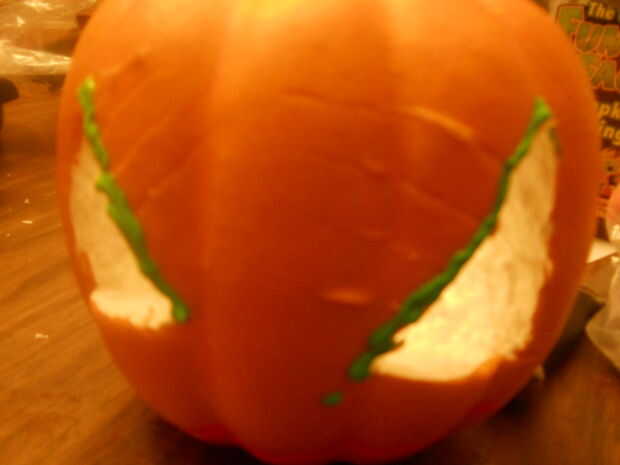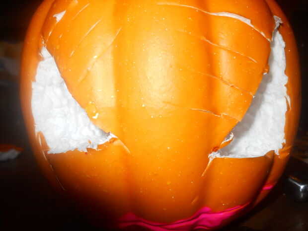 Tallado de calabaza de espuma de poliestireno con brillo en los ojos oscuros (3 / 4 paso)