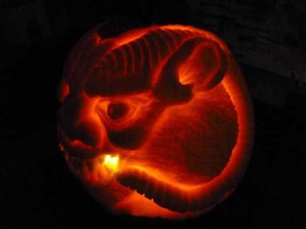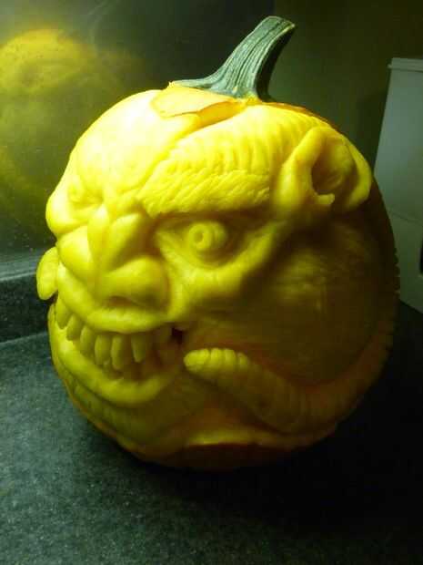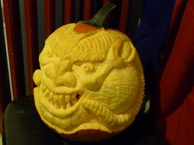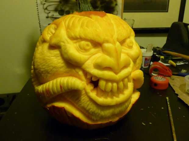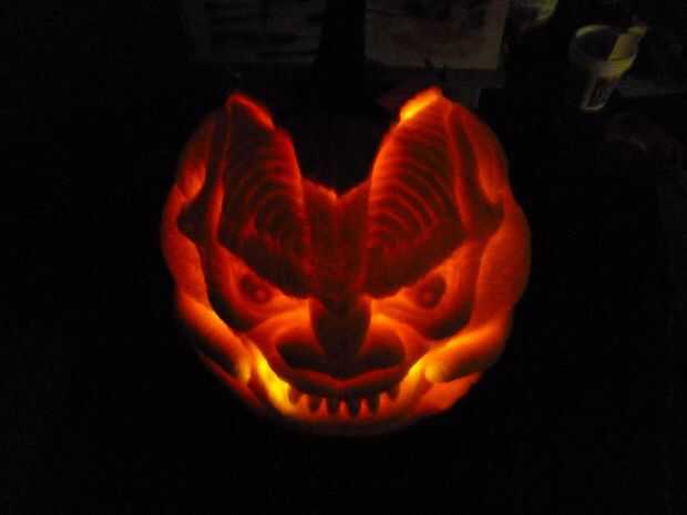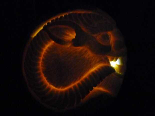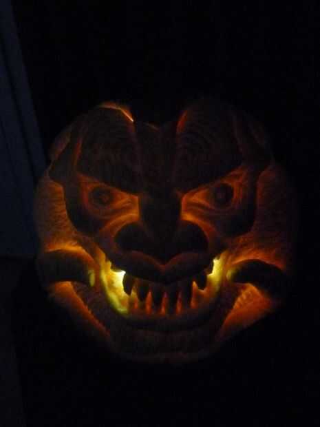 estos son algunos de mis calabazas talladas. Las técnicas se describen bien en Instructables y otros lugares (por ejemplo utilizando una Dremel para cortar solamente el espesor parcial), pero pensé que estos disfrutarse. La mejor parte, creo, es en