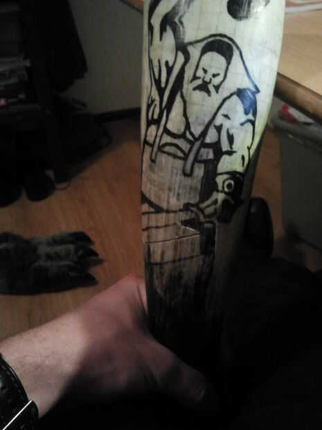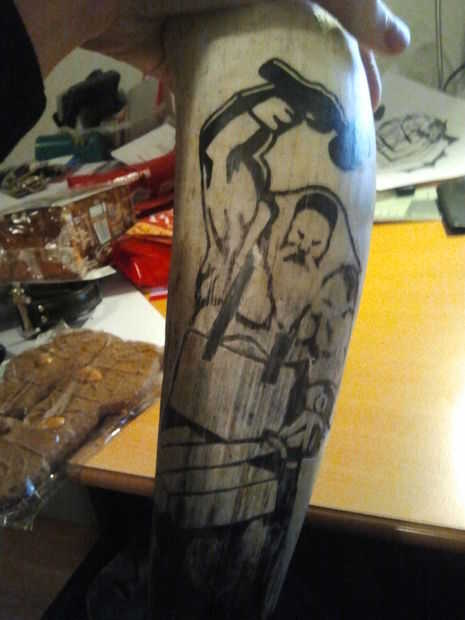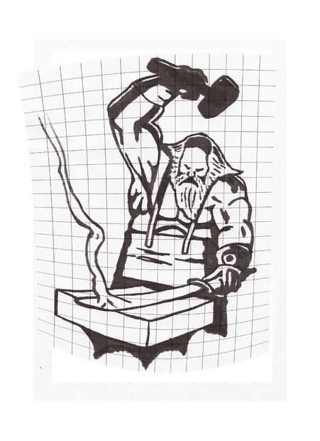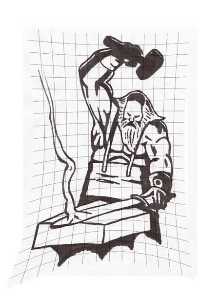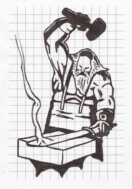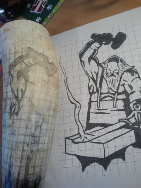 Empecé con una búsqueda en internet para un cuadro que me. He encontrado una imagen del Dios Hefesto, que me ha gustado mucho. Con un poco de ayuda de Photoshop y un marcador permanente negro grueso creé una imagen en blanco y negro apto para mis habilidades de talla. El cuadro fue analizado y líneas fueron agregadas por lo que pude sacar en el cuerno.