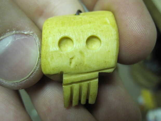 Observe que utilizar unos alicates para sostener la pieza de hueso. Cuando usted corta cosas este pequeño, no debes de tener tus manos cerca de la hoja!