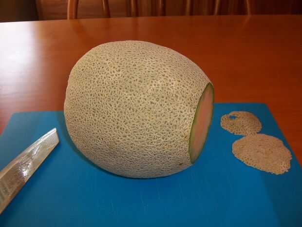 Cortar ambos extremos de la toma melón lo suficiente de cada extremo para exponer la carne del melón y hacer el melón donde pondrán de pie en cada extremo. puedes ver por mis piezas de chatarra poniendo al lado el melón que no necesita cortar mucho para hacerlo a pie.