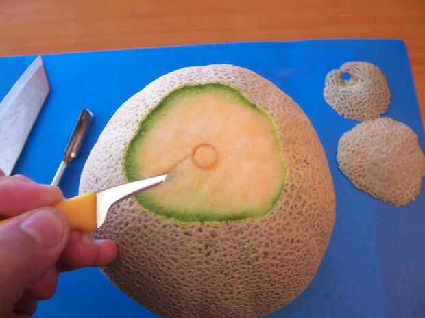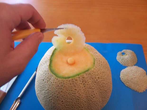 tomar el cuchillo Thai y poner la hoja sobre el melón con la punta tocando el borde del círculo que acaba de hacer. y lo que quieres hacer es básicamente a cortar un anillo de melón de alrededor del círculo central.