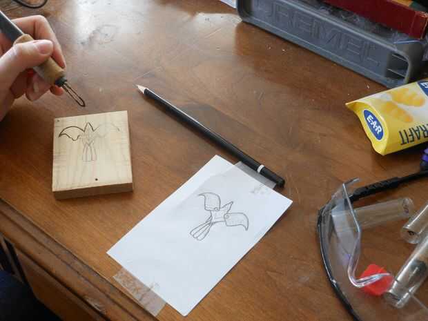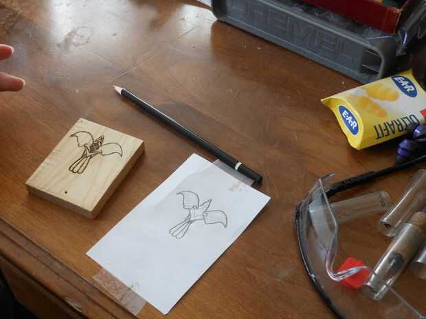 Este paso es simple engaño. Desde que he reducido talla experiencia, prefiero grabar las líneas primero por lo que pueden guiar los cinceles más tarde. Este fue mi segundo trabajo de talla (el primero es escondidas en la parte superior de la primera foto derecha), así que el truco parece funcionar bastante bien!