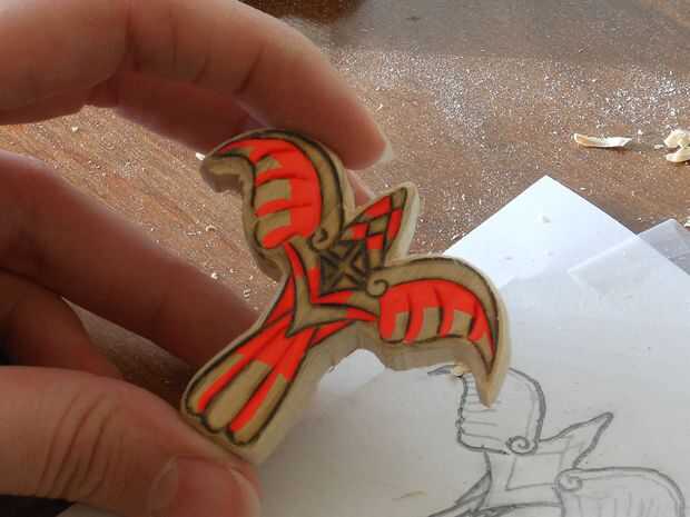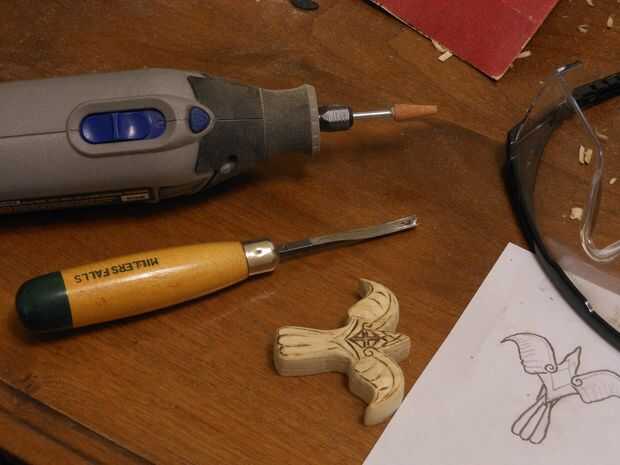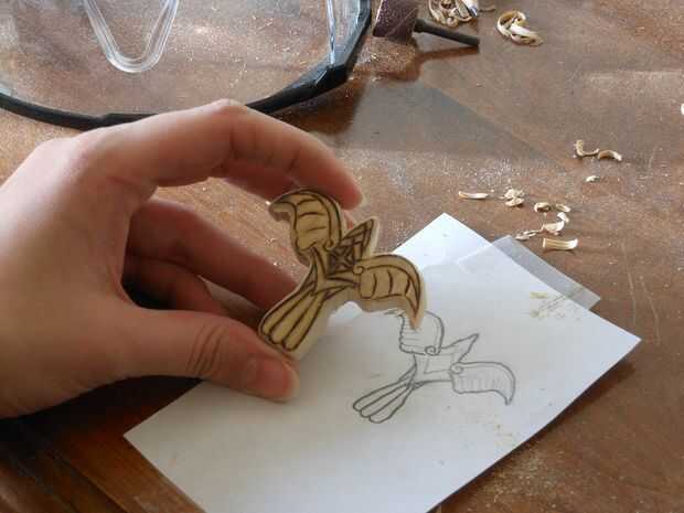 Entonces, solía poco pulido de la herramienta rotatoria para tallar las características como se muestra en rojo en el cuadro 03. Tallada la curva principal a lo largo de las alas, entonces cada una de las grandes plumas y repetido por la cola. El centro y el cuello son más delicados, por lo que he intentado hacer algunos detalles más pequeños se. El cincel fue útil para ángulos filosos, pero si no la broca pulida fue efectiva para toda la obra.
