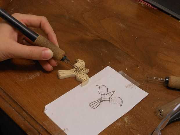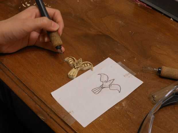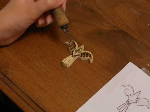 Generalmente iba de una punta plana al hacer degradados, pero puesto que el pájaro es demasiado pequeño elegí una pluma de caligrafía. Temperatura media (6/10, en mi estufa de leña) y oscurecer las partes que fueron excavadas. Quemar ligeramente las zonas más altas, que les deja un tono marrón dorado y no tenga miedo de hacer las zonas más bajas completamente negro. Su talla comenzará a hacer estallar hacia fuera!