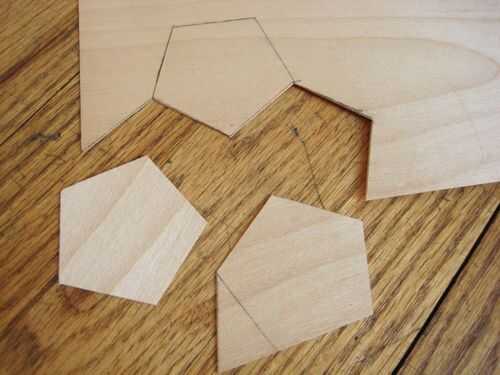 Cortar 10 Pentágono chapa de madera. Trace la plantilla sobre la madera. Si vas a empujar juntos, utilice un cuchillo y borde recto para cortar, si difundes que puede utilizar tijeras. Cortar cuidadosamente y uniformemente como sea posible.