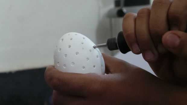 Mantenga el huevo en un ángulo en la herramienta rotativa y presione un poco para hacer un agujero,