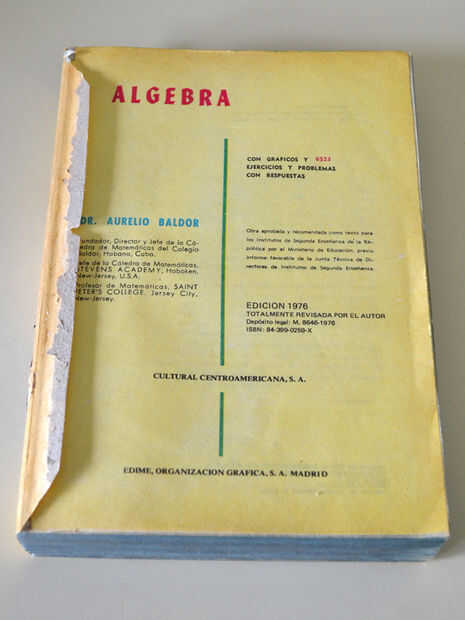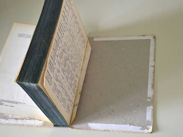 Como pueden ver usé un viejo libro de matemáticas. Lo elijo porque había tres versiones en mi casa, por lo que uno menos no hace una diferencia. Lo primero que quieres hacer es rasgar la cubierta dura. Esto se hace quitando el papel que se adjunta al cartulina todo alrededor de la cubierta. Puede usar sus uñas y ayudarse con el cuchillo del exacto. Tenga cuidado de no cortar las aletas pequeñas que van desde el libro hasta la cubierta, porque los necesitará más adelante. Cuando esté acabado final será con algo similar a lo que muestran las fotos.
