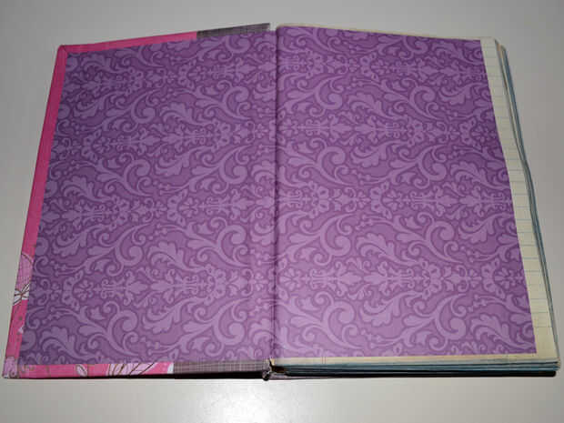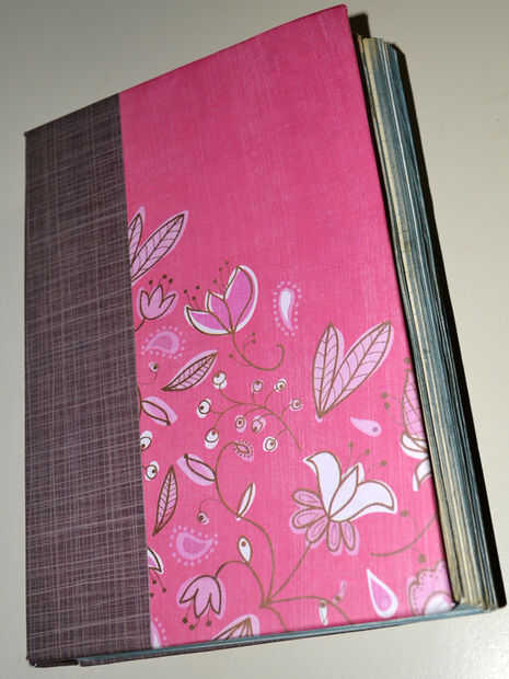 La primera cosa a hacer es cubrir las tapas de cartón con papel de scrapbooking (o papeles) de su elección, para dejarlo tal como estaba antes de que estafan. Desea que los pedazos de papel a ser más grande que la tapa, por lo que se puede doblar alrededor de la cartulina. He usado Spray Mount en este pasos demasiado porque es fácil de uso y se seca bastante rápido. Luego tienes que pegar hacia atrás las aletas en el interior de la cartulina y pegar más papel para reemplazar a la saca y donde termina el papel exterior de la cubierta. Podría pegar algún papel de scrapbooking más en el interior del libro, especialmente si usted quiere escribir algo para tu amor y realizar habilidades de corte horrible.