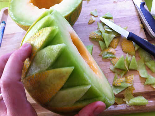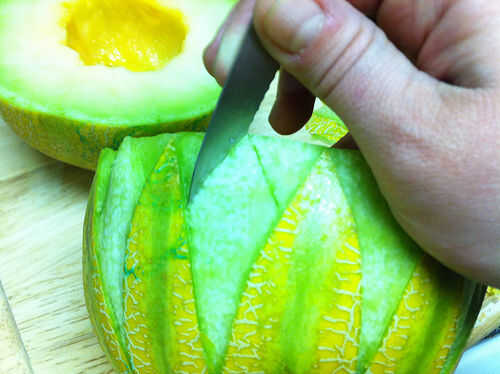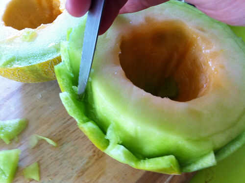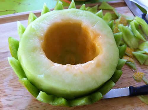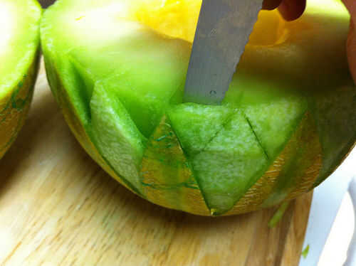Ángulo de su cuchillo hacia adentro hacia el centro del melón y cortar un canal en forma de V todo el camino alrededor del lado corte de melón, dentro de la capa externa de los pétalos, como en la imagen 5 de este paso. Esto es para crear espacio entre la capa externa de los pétalos y la siguiente capa.