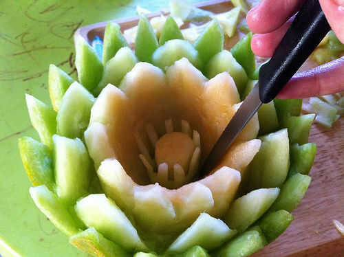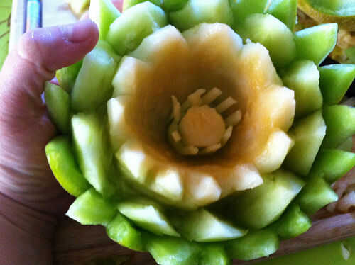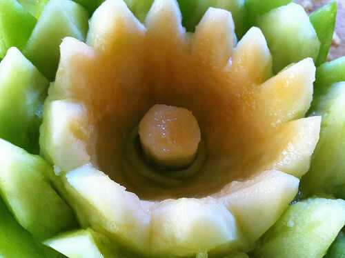 Usé una repuesto rebanada delgada de melón en el pedazo de centro y mantener en su lugar dentro del centro del loto. Yo entonces cuidadosamente envuelto la tira con rectángulos en el pedazo de centro, colocándola con el cuchillo (los dedos son demasiado grandes para esto).