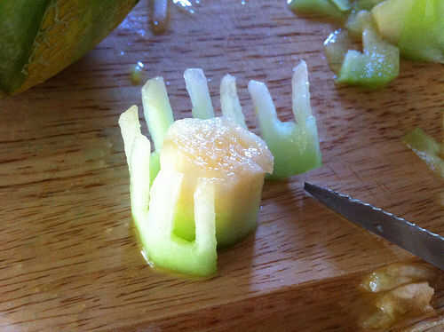 Cortó la piel, luego cuidadosamente había tallada una rebanada fina de alrededor del centro de la parte. Esto me dejó con una tira delgada y curvada que alrededor de un pedazo de centro redonda de melón. Doblé hacia fuera el pedazo de centro un poco más, luego, corte largo, rectángulos finos de la franja a lo largo de un borde (véase figura 4 en este paso).