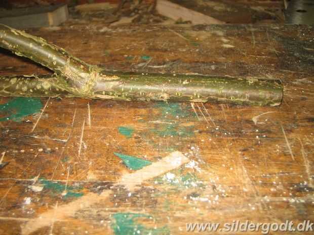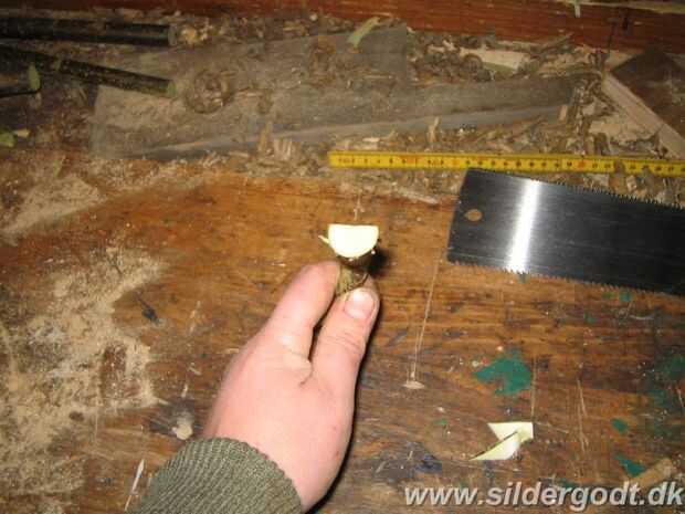 Con el cuchillo empieza a cortar el palo estrecho en la parte trasera. Esta parte plana será la parte que va contra la pared, cuando el gancho está montado en la pared...