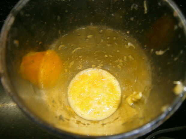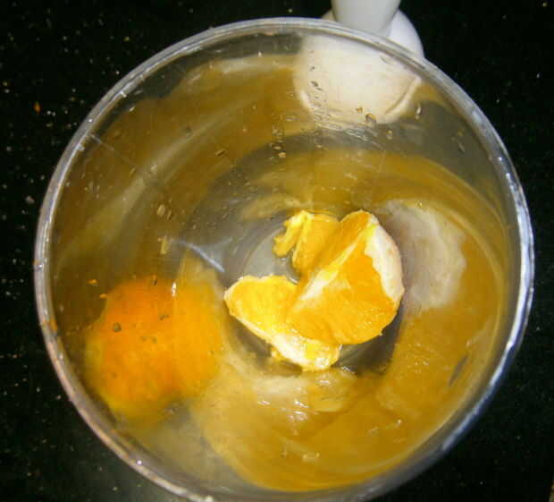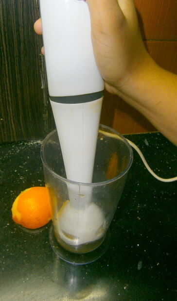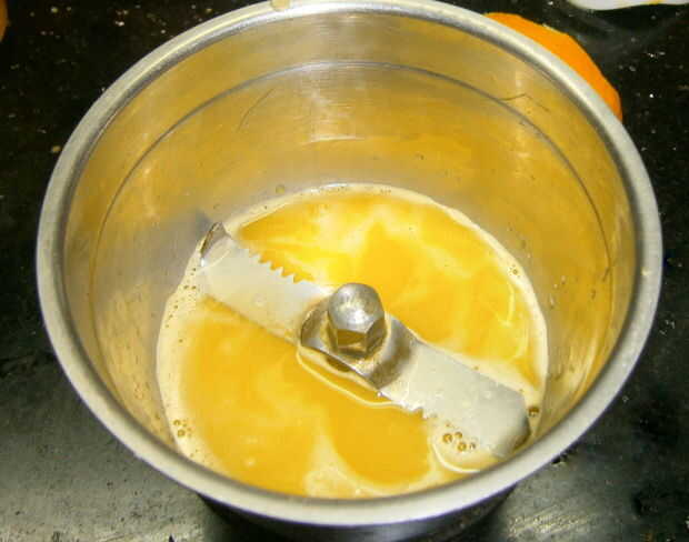 Quitar las semillas y mezcla la naranja con la batidora. Colar el puré para obtener el jugo de la naranja.