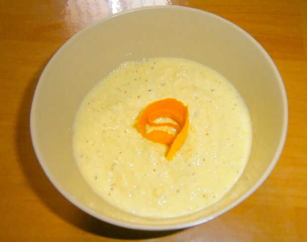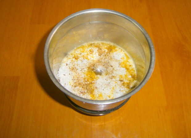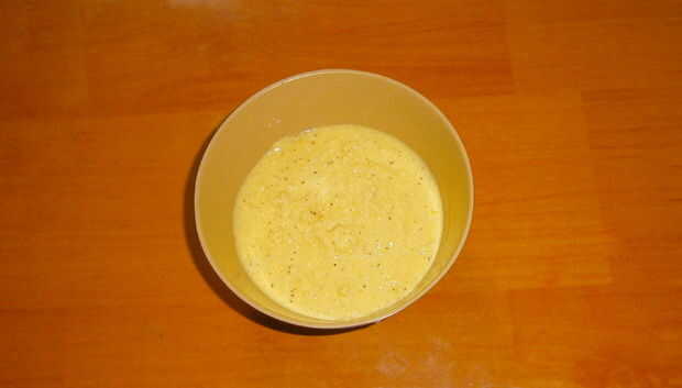 Al jugo de naranja añadir coco rallado, sal y pimienta en la batidora. Moler en la batidora para formar una textura picantes.