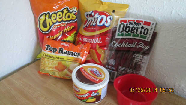 1. 1 paquete de fideos Top Ramen sabor del pollo. (Sustituir con cualquier sabor de fideos Top Ramen).