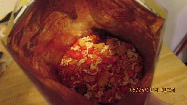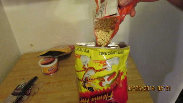 2. Retire el paquete de sabor del paquete de fideos ramen y reservar para este último, vierta todos los fideos de ramen en la bolsa machacada de Cheetos.