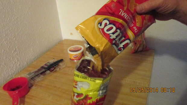 1. Vierta aproximadamente la mitad de la bolsa de Fritos en la bolsa de Cheetos de triturado.