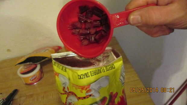 3. Agregue pedazos de palillo de morcilla picado bolsa de Cheetos.