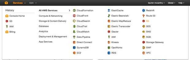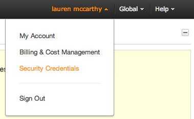 3. Inicie sesión en el http://aws.amazon.com/console/ panel y configurar las teclas de acceso. En la esquina superior derecha, haga clic en su nombre, luego "las credenciales de seguridad"