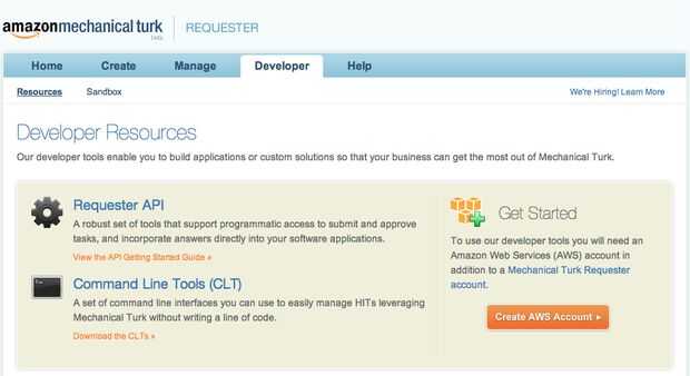2. Además de a una cuenta del solicitante, se necesita una cuenta de Amazon Web Services. Haga clic en la ficha "Programador", luego haga clic en "Crear cuenta de AWS".