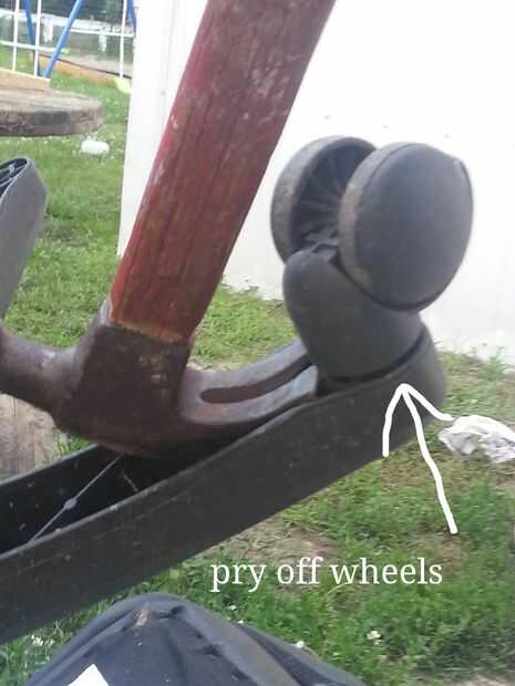 La mayoría de sillas de oficina utilizan una fricción para mantener las ruedas en la base de la silla. Si ellos no sacar con la mano el extremo de la garra de un martillo va a salirles fácilmente.