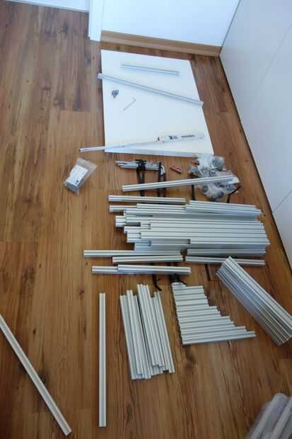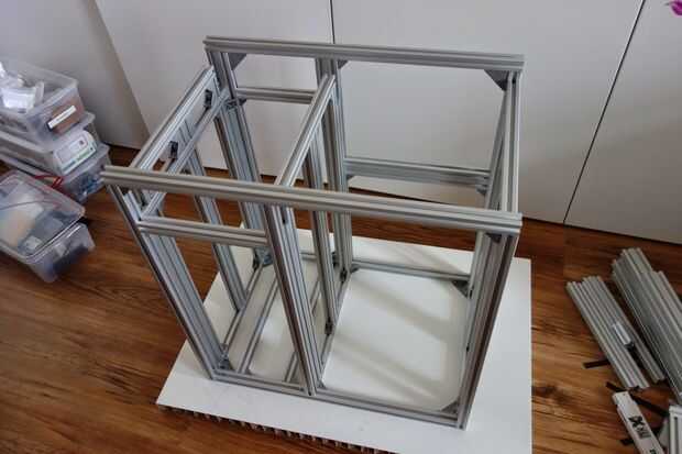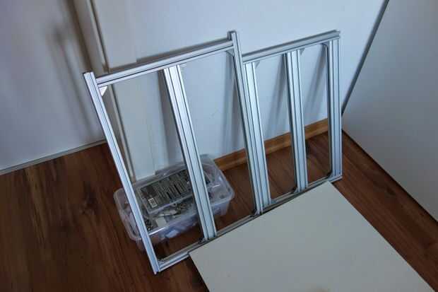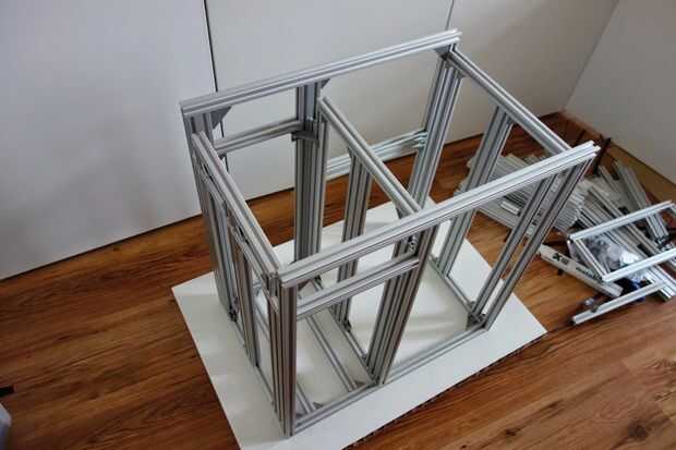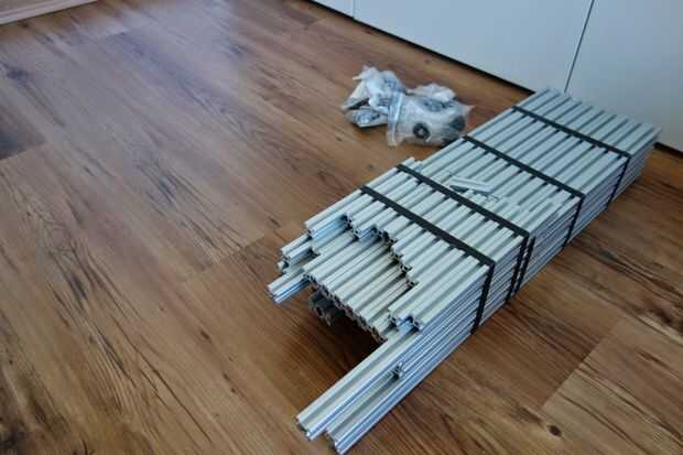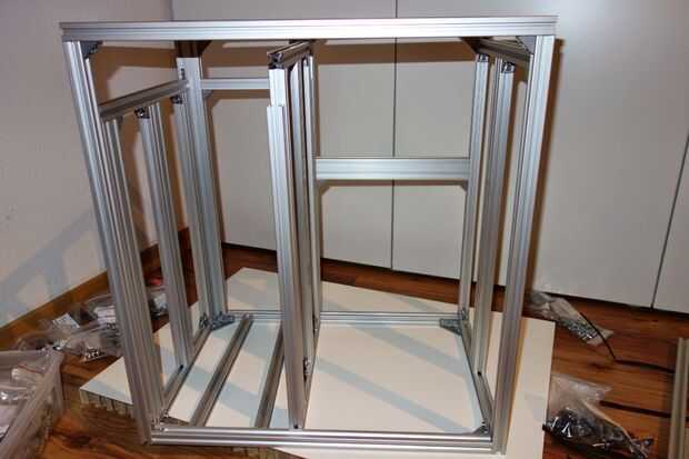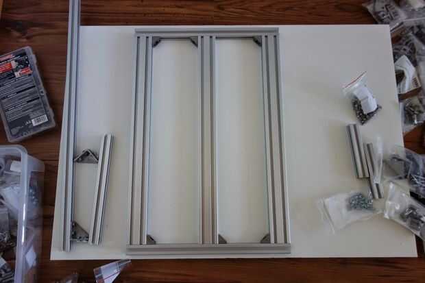 Ordené las extrusiones de aluminio de acuerdo con la construcción de CAD. Sólo usé extrusiones de 20 x 20 y 20 x 40 - estos son los más asequibles. Después de una semana, vino la cortadas a la longitud exacta. Tornillos, abrazaderas de esquina y otras partes para el ensamblaje del marco casi en su totalidad son originarios de China. Toma algún tiempo para enviarlos, pero es la fuente más barata que conozco.
