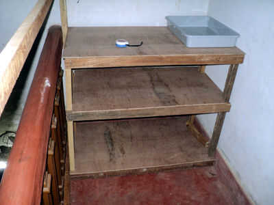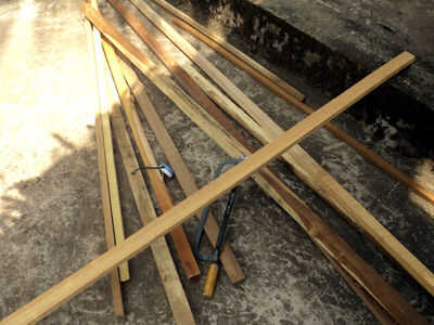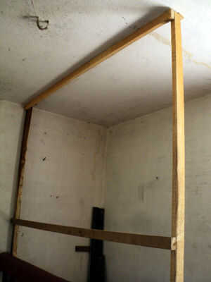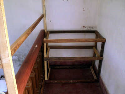 Construir un cuarto oscuro pequeño en la terraza de mi casa. Usé tablas de madera de 2 x 1 pulgadas para construir el marco de la sala. Usé el Sunpack para la pintura negra de walland aplicado sobre sunpack azul. Después pegué el paño de lana para que sea un aire y ambiente resistente a la luz. El interior he puesto una mesa de taller, una ampliadora y un estante que me hice. Debido a la falta de espacio Coloque una bañera grande en lugar de un lavabo.