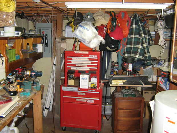 Aquí es la caja de herramientas principal, drillpress, y donde cuelgo bolsas, cuerdas y alguna ropa de trabajo. Esta "esconde" algunas de las herramientas más pesadas en la espalda (viejo Hanon, antiguo miterbox, etc.)