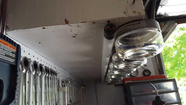 Tenga en cuenta cómo utilizar sus herramientas. Y los que utilizas más a menudo cerca del centro. Hice una pared rodante para ayudar a lograr herramientas de mantenimiento de la fuera de bolsas de herramientas y a su alcance.