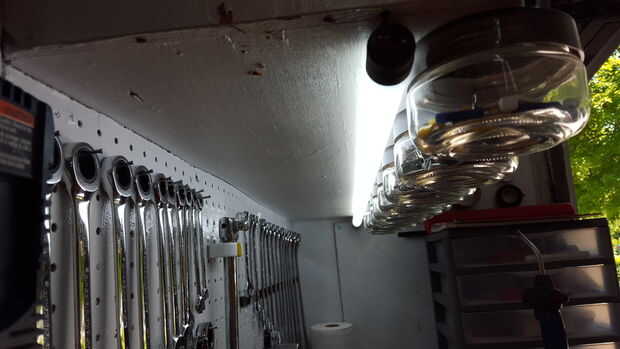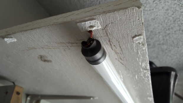 Iluminación de banco adecuado es una necesidad. Así que instalado una bombilla 4 T8 Ballas bajo la cornisa en la parte posterior del Banco y funcionó cada uno de los cables y soldar los extremos de cada bombilla y tapa los extremos con calor encogen. Esto me permitió poner cada bulbo donde quería luz. No tener un accesorio permite mucha flexibilidad.