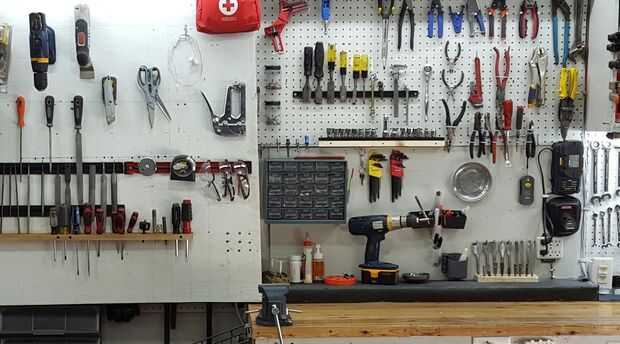 Una estrecha franja de cipreses a lo largo de la parte frontal de la pared del balanceo lleva la última plana y destornilladores de cabeza Phillips.