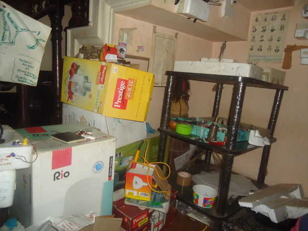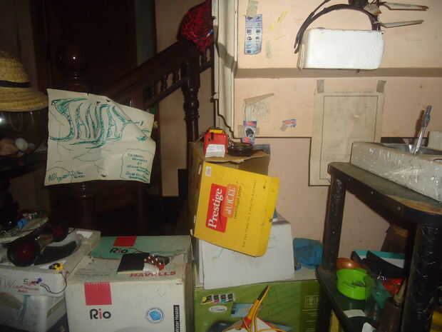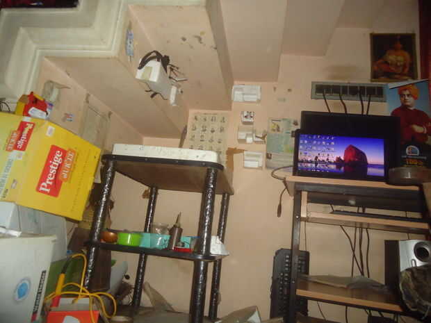 hai chicos esto es el taller más pequeño del mundo. Se encuentra debajo de la escalera. Los componentes de la electrónica como resistor, condensador, transistor, IC etc se almacenan en thermocoles, en latas. Los thermocoles son en su mayoría pegados en latas de muros son el soporte de la TV. Multímetro, soldadura de hierro y otras herramientas se guardan en cajas de cartón. circuito esquemático que estoy trabajando es pegada en la pared. mi PC está allí además el soporte de la TV.