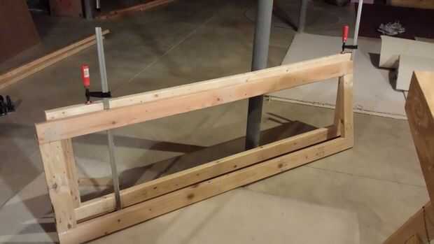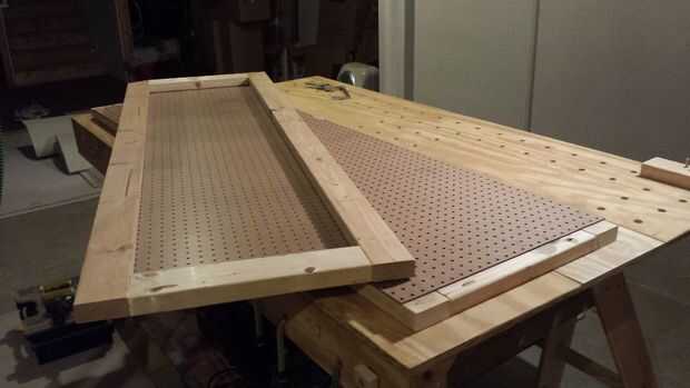 El panel lateral es 78 "x 24", y el pegboard se cortaron a 75 "x 24" por lo que hubo un espacio de 1 1/2" en la parte superior e inferior para los conjuntos superior e inferior del panel (contrachapado de 2 x 4 y 1/2"). Pegboard se atornillan en el marco con tornillos de drywall de 1 1/4". Asegúrese de que los tornillos están lejos de la línea central de 2 x 4 para que no lo hacen interferencia con los agujeros de la estantería ajustable que se perforarán más tarde.