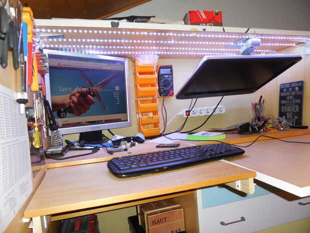 Una buena iluminación es un punto también importante para un taller. Usé tira led y para añadir algo de diversión, he elegido RGB led con un controlador más alejado de la música IR:
