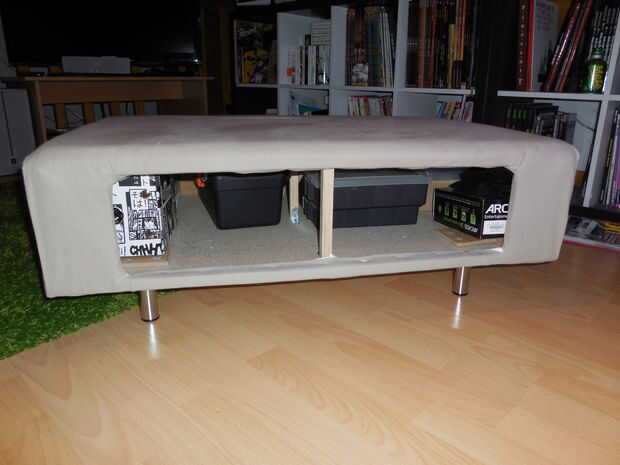 Porque quita los pies de los muebles, el asiento está ahora a una altura de stand no. Así que construí mi propio asiento PUF desde el reposabrazos de un sofá viejo. He volteado el reposabrazos y añadir 4 patas. Luego añadí algo de madera para consolidarlo, y cubrí con textil para un mejor aspecto visual. Porque el reposabrazos era hueco, puedo poner en orden algunas cosas dentro de.