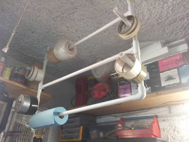 Tratando de maximizar el espacio en mi pequeño taller hice este organizador cinta y carrete colgando desde el techo