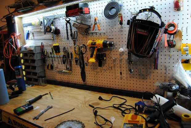 Después de haber terminado con la estructura comencé a mudar mis herramientas de mi plaza de garaje. Mi banco o mesa de trabajo ocupa un lugar prominente en mi nuevo taller. Ahora dispongo de mi sierra de mesa, mi sierra de ángulo, la esmeriladora y