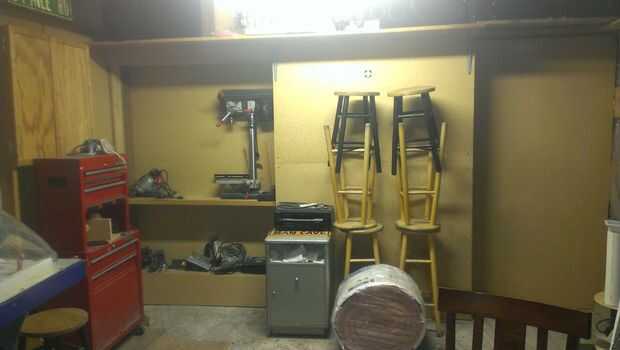 Las puertas regulares son aburridas. Se trata de una puerta de bolsillo basada en hardware de la puerta de granero. Debido a la capacidad del hardware, es posible construir estantes en el diseño. Hay algunas impresionantes puertas ocultas que cuando recortan hacia fuera son imposibles de detectar... este no es uno de ellos. Es un taller en un edificio hacia fuera, tan... fina carpintería sería un poco fuera de lugar... El secreto aquí es que mucha gente verá el estante y no una puerta.
