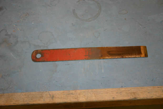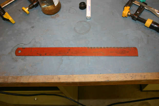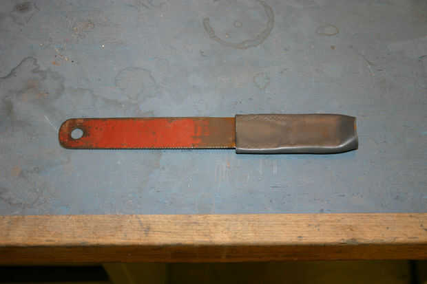 Luego que muelo el borde raspado. Después de un acabado con mi lijadora el borde fue lo suficientemente fuerte para mis propósitos. Para proteger la hoja y a mí, construyen una envoltura de un viejo tubo de PVC. Por lo tanto me calienta el tubo y presiona junto con mi tornillo de banco.