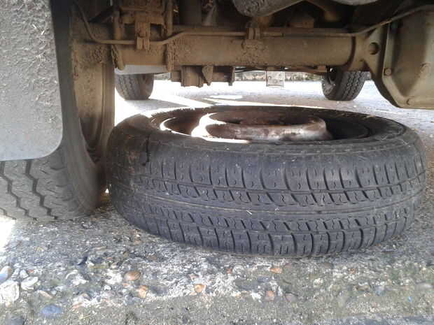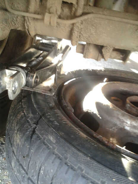 Una vez que la base de las necesidades de la rueda se coloca debajo del puente del en este caso estoy usando el eje trasero en una furgoneta y colocarlo bajo el punto de elevación y configurar la base de la toma lo más cerca posible a la rueda por lo que empuja la rueda hacia abajo con tan poco flexible como sea posible.