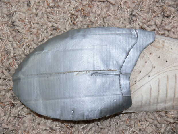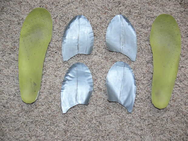 He intentado cortar plantillas de calzado viejo para hacer almohadillas de la pata delantera, pero esto no funciona casi tan bien. Insertos de zapatilla antigua son comprimidos en el centro y gruesa en los laterales, que obstaculiza los lados y la parte delantera del pie cuando se apilan juntos. Las almohadillas de antepié cinta de conducto DIY no se comprimen como plantillas del zapato típico.