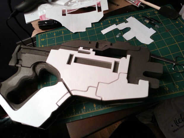 El siguiente paso fue añadir las capas que se construyen de las capas base. Esto se logró mediante cortando el patrón como en el video de Props castigado ligado al final de este instructivo. Este paso especialmente requiere un conocimiento íntimo de la pieza que está construyendo y es donde el material de referencia se viene en muy práctico!