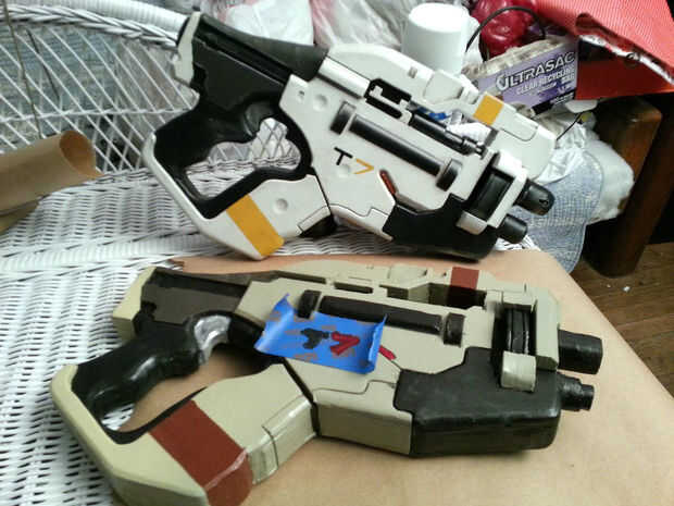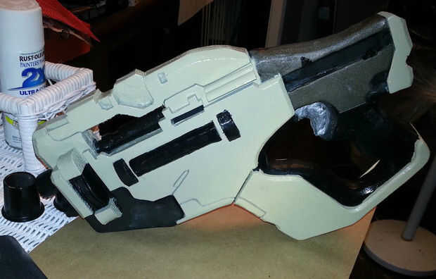 Con cinta de enmascarar y papel adhesivo, primero rociar en color beige. Después de dejar que ese seco, enmascarados las áreas negras de la empuñadura, la empuñadura delantera y los detalles negros alrededor del cañón, la cámara y a los lados. El área por encima de la empuñadura que hice en un color metálico de metal de arma.