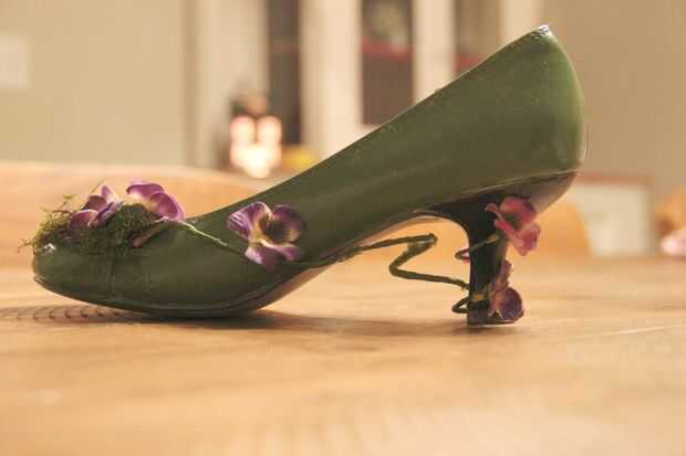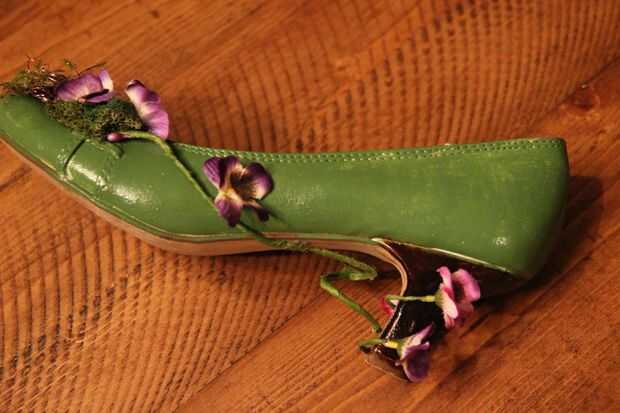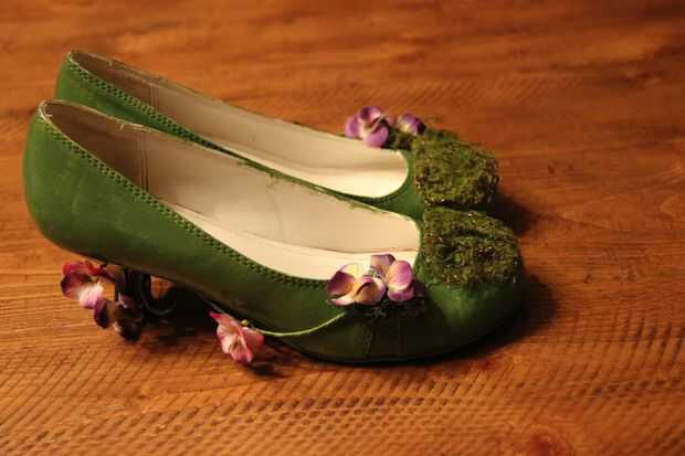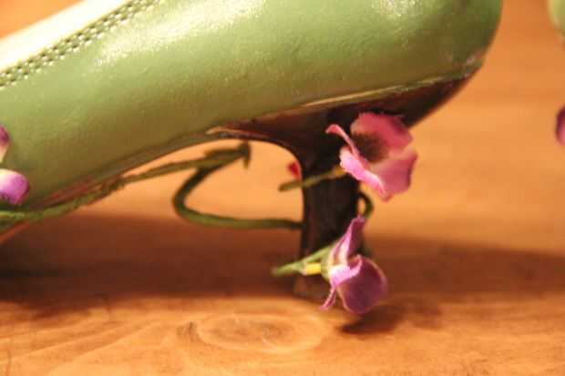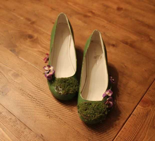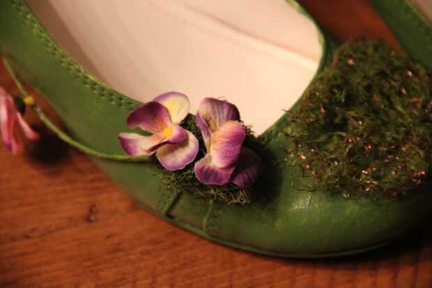 Ahora esta es la parte más creativa de todo, usted necesita conseguir su musgo y vid falsa y así como un "paisaje" en sus zapatos. Hice la vid en el talón para que parezca está creciendo el talón. Usé pegamento caliente para fijar luego los zapatos.