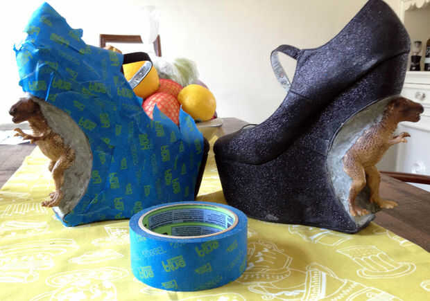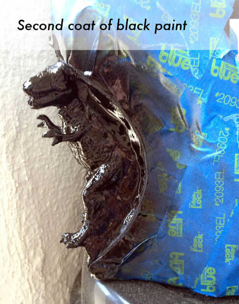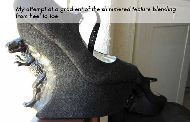 Mi plan de pintura era hacer una capa base negra en el T-rex y del moldeo a presión, luego una capa de brillo en el resto del zapato. Pero cuando llegué a la tienda de arte, una pintura en aerosol textura brillo en un color gris plata muy similar al color de los zapatos. (Premio!)